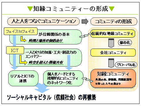 インターネットは、情報の収集・発信の両面において個人をエンパワーする。従来の地域団体や会社といった既存組織に埋もれていた人々の潜在力を生かすチャンスが訪れている。そこで今、期待されているのが、会社や地域団体など従来型の組織とは異なり、共通の志や価値観、問題意識等を共有するメンバーが集まる知縁コミュニティの形成である。